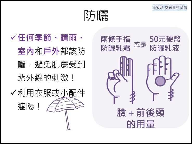 對於上述的丘疹膿皰疹、皮膚乾燥發癢、光敏感、色素沈澱,防曬都是很重要的預防和保養原則。不管陰晴雨天、春夏秋冬、室內或室外都建議防曬,早上十點到下午兩點避免出門日曬,並搭配使用衣物或遮蔽物(傘、帽子、口罩、袖套等),防曬產品的選擇(紫外光寬頻防護)、正確用量和勤補擦都很重要。(皮膚科醫師教您看懂防曬乳、防曬迷思大破解)。