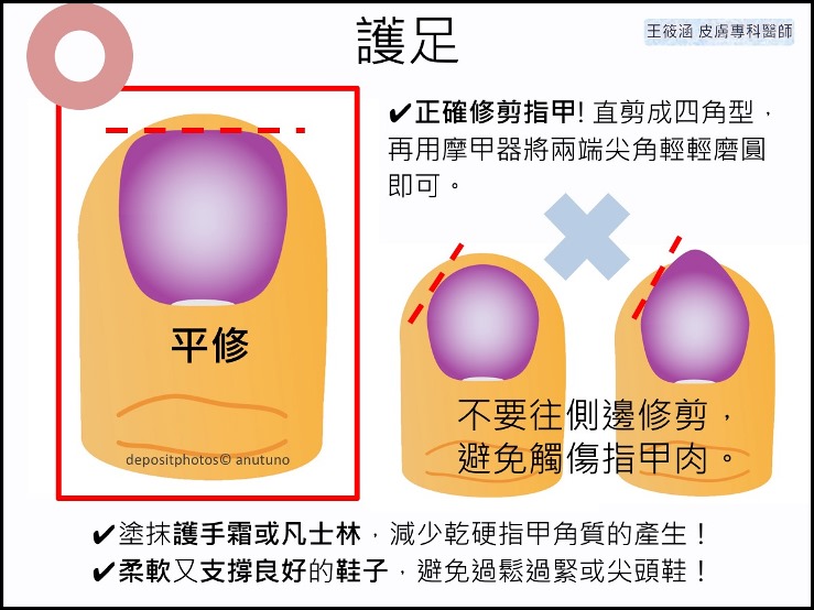 • 請穿著舒適彈性良好的鞋子,減少手足的摩擦刺激(少做家事、提重、打字、碰水、過度走路或運動等等)。