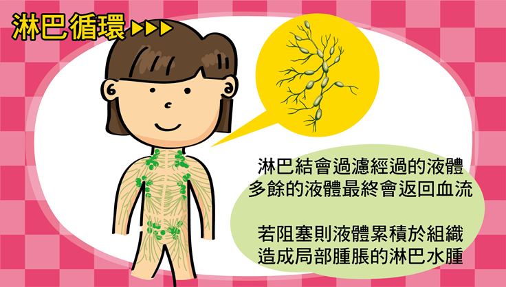 淋巴循環是免疫系統的一部分,淋巴結會過濾經過的液體,留下細菌、病毒、及廢物,由白血球破壞。淋巴管裡多餘的液體最終會返回血流,如果沒有正常的淋巴引流或淋巴管阻塞時,液體就會累積於組織內造成局部腫脹,例如常見受到影響的部位是手臂或腿部,我們就可說此處有淋巴水腫。