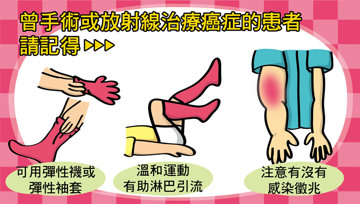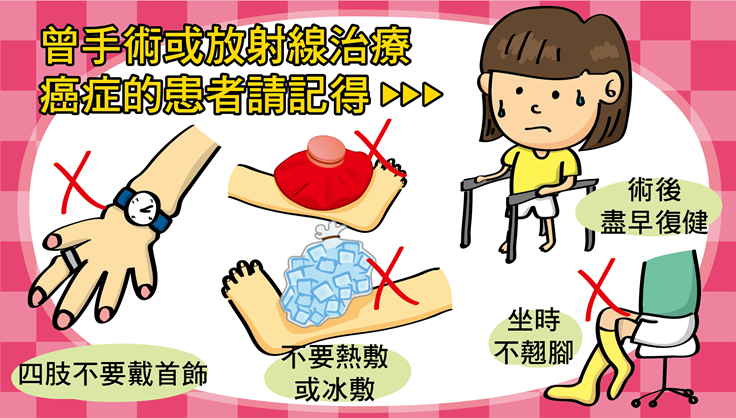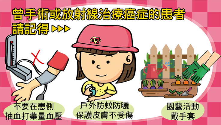 因此提醒各位,若你因為乳癌、生殖器官癌症等而接受了會移除淋巴結的手術術式,或是曾接受放射治療,術後要盡量記得以下注意事項: