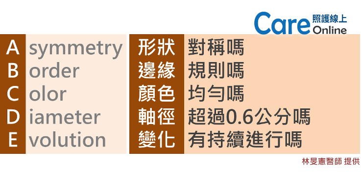 因此請大家一定要認真去觀察痣的外觀變化,這裡提供五個重要的線索,讓大家可以自己去檢查痣的(A)形狀是否對稱 (B)邊緣是否規則(C)顏色是否均勻(D)軸徑的大小是否超過 0.6 公分(E)外觀是否持續變化。