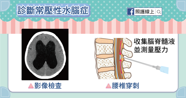 要評估常壓性水腦症,醫師會選用兩種方式,首先可用影像檢查(電腦斷層及核磁共振),不但能看出水腦症,也可用來排除其他疾病。