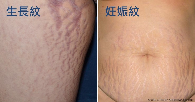 如果我們把皮膚想像成身體的一層薄外衣,皮膚的結締組織就像是衣料的纖維。皮膚會因為軀幹持續的膨脹進而撕裂皮膚內部的結締組織,這時候皮膚就會出現許多帶狀或線狀紋路。