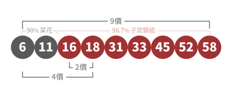 ● 9價:4 價疫苗再加上 31,33,45,52,58 五型,除了原本對菜花的防護,更讓預防子宮頸癌、外陰癌、陰道癌的效果上升到 96.7%。