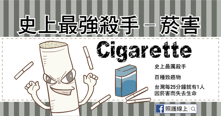 菸草中含有超過千種的化學物質和化合物,請不要覺得這太超值了,這些物質中有數百種有毒,還有近百種的致癌物,所以吸菸幾乎會傷害身體的每一個器官,還會致癌。想想看,如果拍成電影的話,香菸可以化身為史上最厲害的殺手,電影名稱會像是「全面攻佔–身體淪陷」這樣,電影海報上頭還會有「百種致癌物!」及「台灣每25分鐘就有1人因菸害而失去生命!」如此標語。