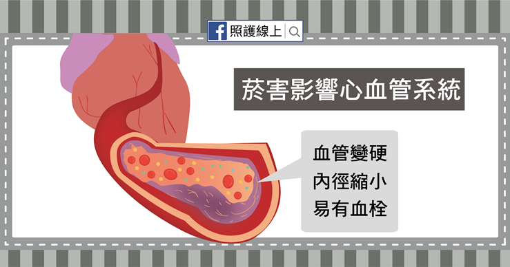 除了癌症外,心血管疾病也是一大死亡主因,而吸菸就會提高我們罹患心血管疾病的機會!因為香菸內的物質會破壞血管,血管因而變硬、內徑縮小,患者血壓愈來愈高(高血壓),心臟做工愈來愈費力(可能會心臟衰竭),還更容易形成血栓,增加腦中風的機會。