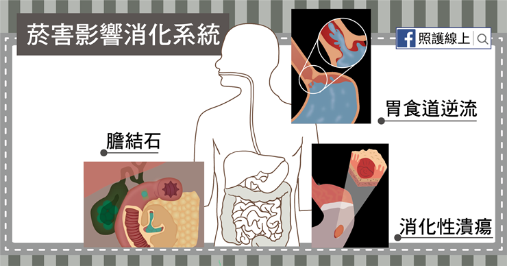 消化系統是另一個會被香菸影響之處。舉凡我們熟悉的胃食道逆流、消化性潰瘍、大腸息肉、膽結石、胰臟炎、胰臟癌等病,有菸癮者都比較容易得到喔。