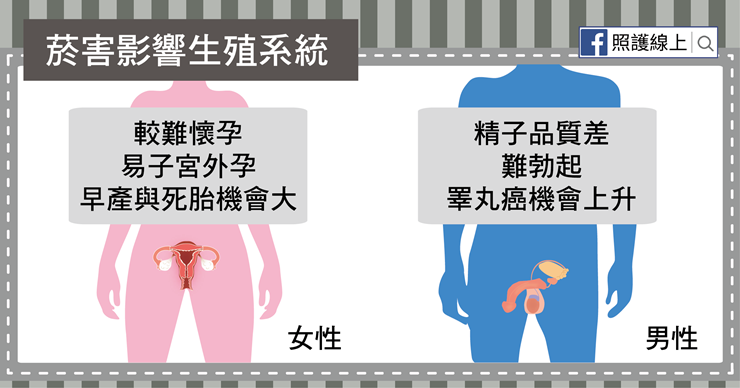 生殖系統是另一個備受菸癮傷害之處。女性抽菸會影響懷孕生產,像是會讓女性較難懷孕、容易子宮外孕、早產機會大、死胎機會大、胎兒容易體重過輕、後來嬰兒也較容易猝死。