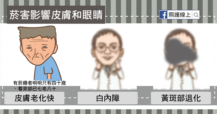 有菸癮者容易有黃斑部退化,視野中央的影像變得模糊。同時抽菸也會增加一般人罹患白內障的機會。