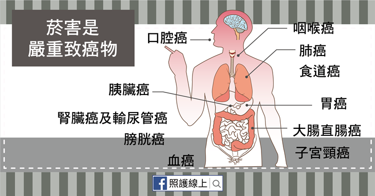 說了這麼多,我們最後要提到,吸菸會引發全身各處的癌症,也會提高患者因癌症死亡的機率。引起癌症的主要物質是焦油,以下就是有菸癮時容易罹患的癌症。