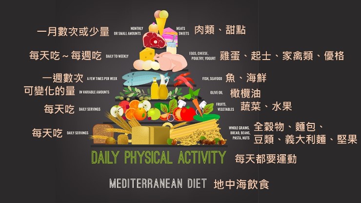 許多研究已證實飲食中多攝取蔬菜、水果、魚類,減少油脂攝取,可以降低慢性病的發生,增加存活率。地中海飲食正好符合這樣的飲食模式。除此之外,地中海飲食對老年人認知功能與身體機能是有益的,因此不僅能活得久而且活得健康、活得有生活品質。