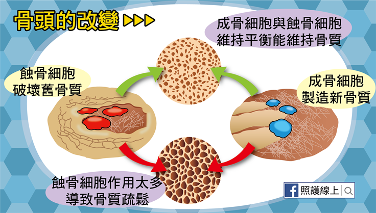 但其實骨頭一直在變,由「蝕骨細胞」移去老舊骨質,由「造骨細胞」製造新鮮骨質取代,骨頭是個不斷改變成長的活組織喔!