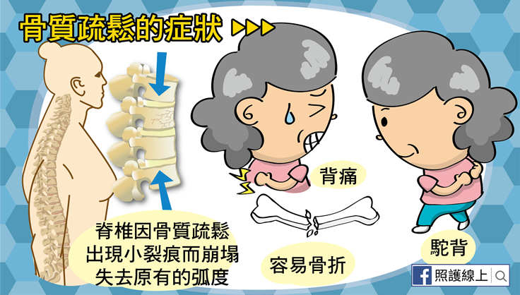 骨質疏鬆的患者往往沒有明顯的症狀,常常是到了患者姿勢變得很怪,才知道是因骨質疏鬆而脊椎變形導致了長期背痛;或甚至是等到真的骨折了,才知道自己有骨質疏鬆。