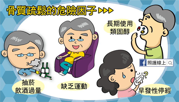 除了年紀變大以外,體重過輕、缺乏運動、抽菸、缺鈣或維生素D不足、甲狀腺機能亢進、早發性停經、飲酒過量、長期使用類固醇的人都會更容易骨質疏鬆。(身體質量指數BMI計算機)