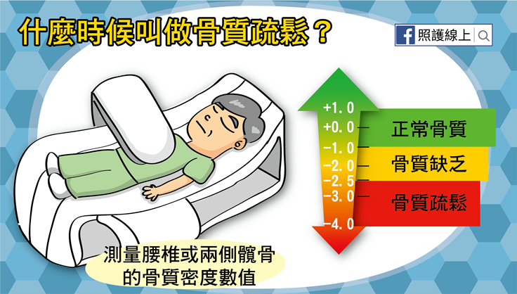 骨質密度檢查機器是用中軸型的雙能量X光吸收儀測量腰椎或兩側髖骨,假使數值>= -1是正常值,骨質正常。數值界在-1與-2.5之間的代表骨質缺乏,若得出的數值<= -2.5代表骨質疏鬆。