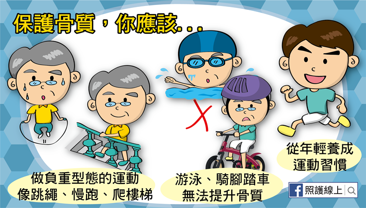 負重型態的運動,像是跳繩、快走、慢跑、爬樓梯等運動會讓骨頭承受身體重量並做出移動,對提升骨質密度有幫助。但要選擇這些運動時要先了解自己的條件,假使已經有骨質疏鬆的話,就不要做太高衝擊的運動,以免造成骨折。