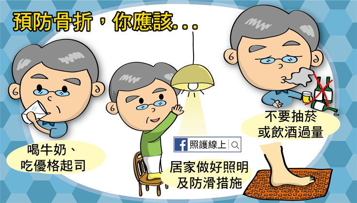 除此之外,我們也要嘗試減少骨折的風險,防止併發症出現,例如維持理想體重減輕骨頭的負擔、改善照明及居家環境預防跌倒等皆是有效的方法。