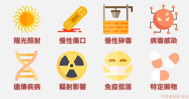 3. 病毒感染:最有名的病毒就是人類乳突病毒(HPV)。當人類乳突病毒長時間潛伏在皮膚裡,會提高宿主出現鱗狀細胞癌的機會。