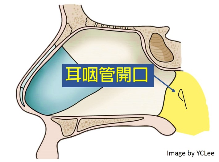 上圖中箭頭指出的位置為鼻咽部,耳咽管的一端開口於鼻咽,因此耳咽管功能與鼻部也經常相關。
