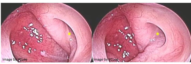 圖中的星號表示耳咽管於鼻咽部的開口,左圖中耳咽管呈關閉狀態,右圖中耳咽管於吞嚥時呈現開啟狀態。