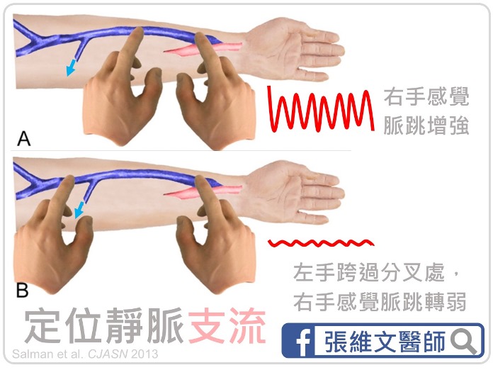 若手邊有聽診器,可以將它放在廔管所在的表面皮膚上,從手術疤痕處,沿著廔管的血液流向一直往上聽,直到鎖骨下方。