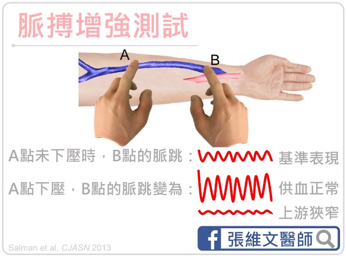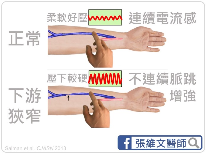 正常情況下,這樣的電流感應是連續性的,摸起來柔軟、很好壓,不太會有脈搏跳動感;若電流感變弱且流動感變得不連續、甚至出現脈搏一跳一跳的感覺,壓下去很硬,就表示廔管可能出問題了。