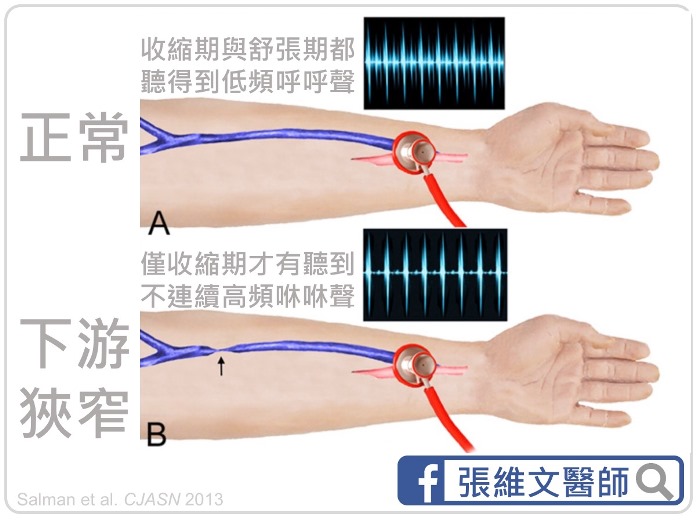 健康的廔管血流聲,應是呼呼呼、低頻而連續的聲音;若聲音變得咻咻叫、高頻且不連續,則代表在聽診處下游(即較靠近心臟的肢體近端)有狹窄的情形。