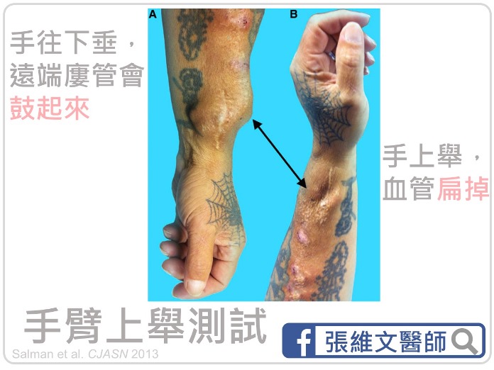 要注意的是,此測試法只適用在自體動靜脈廔管;人工血管因不如自體血管壁有彈性,抬手前後,血管腫脹與塌陷的程度差異不明顯,無法利用這個方法來偵測靜脈血是否不易流回心臟。
