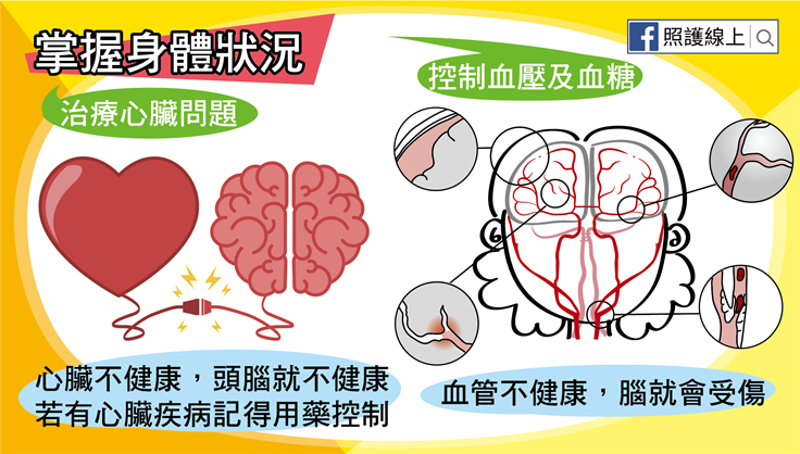 ● 治療心臟問題:對心臟血管不好的,就對頭腦不好。心肌梗塞及心臟衰竭與失智有很強的關聯性。曾經有解剖研究發現,罹患阿茲海默症的患者裡,有高達八成同時也患有心血管疾病。有沒有發現,我們剛剛所說到的,多運動、吃得健康、不抽菸這些也都是心血管疾病的危險因子!因此,如果你調整了生活作息,卻仍被心臟疾病困擾著,記得要聽從醫師指示服用藥物控制心臟問題喔!
