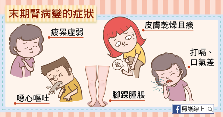 像液體積留就很明顯。無法排出滯留體內的水分會造成手腳腫脹、血壓變高、及肺水腫。另外腎臟衰竭則無法維持電解質平衡,患者血液中的鉀離子濃度若升高,我們稱為高血鉀,這會影響心臟功能,還可能會致命。腎衰竭後患者骨頭變脆弱,骨折機會升高;免疫力變差,容易感染;紅血球的生成不足,就有貧血問題。另外腎衰竭還會影響中樞神經,患者人格改變、注意力不集中、也可能癲癇發作。
