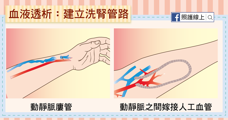 大家比較常聽到的應該是「血液透析」,這也是台灣多數患者選擇的洗腎方式。患者需要先接受動靜脈相接的手術(通常在手臂),或在動靜脈之間用一條人工血管相連,大約手術後一個月可以開始用這血管洗腎。