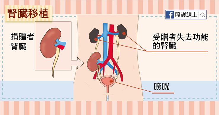 手術時,醫師會將新的腎臟放在患者(受腎者)的左下腹或右下腹,並將新腎臟的動脈靜脈分別與患者的動靜脈相接,再將新腎臟的輸尿管接到患者的膀胱上。術後新腎臟就可以開始工作、製造尿液、代謝廢物了。然而我們的身體會辨識並攻擊外來物,因此接受腎臟移植之後,患者都要持續服用抗排斥藥物,避免身體的免疫系統排斥攻擊新的腎臟。也因此,患者的免疫力會比一般人還弱,要嚴防感染及各種傳染病。