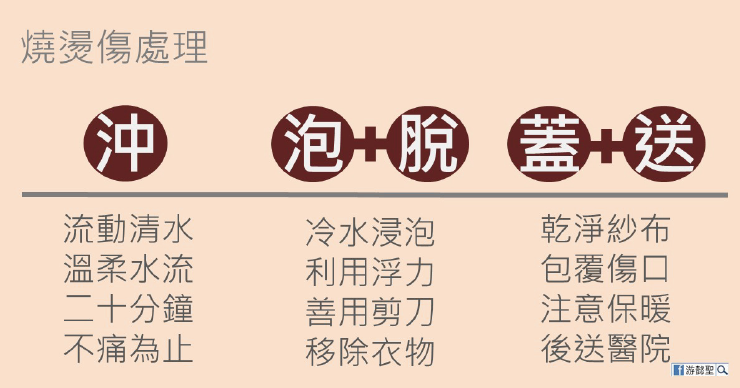 沖脫泡蓋送,目前仍是處理燙傷的準則,沒有錯!只是施行上,有些細節,需要注意。在此,我把這五個步驟,結合成三個步驟,分別是沖、泡+脫、蓋+送,比較簡單好記。