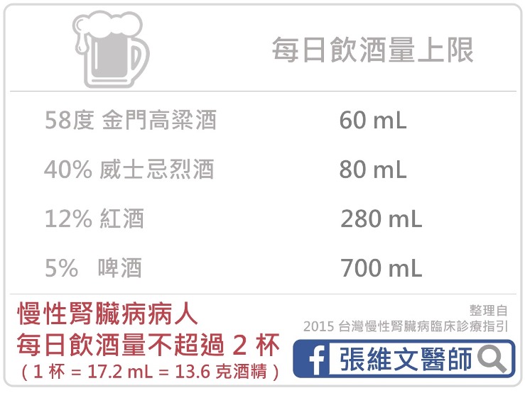 在 2015年推出的台灣慢性腎臟病治療指引中建議,慢性腎臟病病人,每日飲酒量不宜超過 2杯(每杯的標準量為 17.2毫升酒精,相當於 13.6克酒精)。