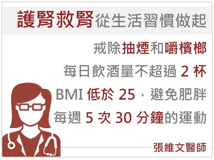 努力戒除抽菸、喝酒、嚼檳榔、少動、肥胖等不良生活習慣,除了可保養腎功能、改善蛋白尿、延緩慢性腎臟病惡化外,也可避免新陳代謝症候群、預防心血管疾病等,可謂好處多多。