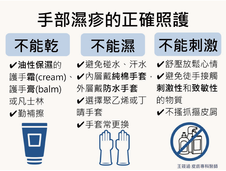 ● 手部濕疹照護的三「不」,不能乾、不能濕、不能刺激。