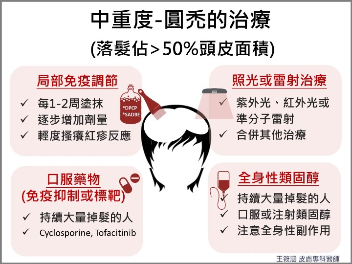 中度的圓形禿達到80%的療效、嚴重的圓形禿有60%以上的療效,但在全頭禿的患者效果約為30-40%,整體平均有50%左右的療效[5,6]。