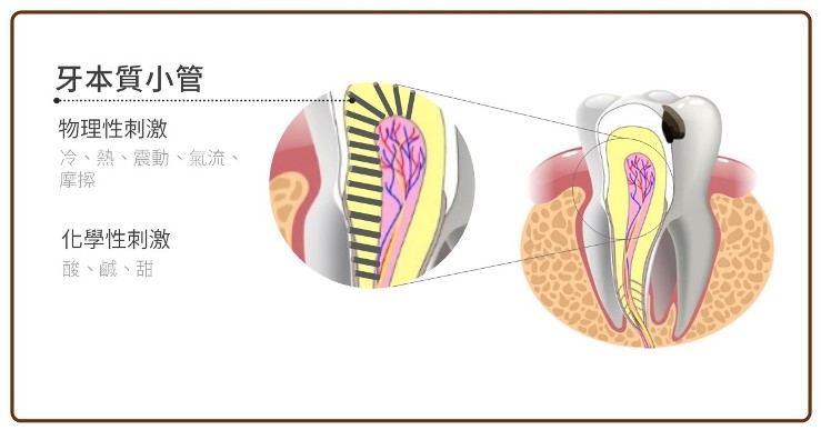 牙冠、牙根都有的牙本質。牙本質裡面有無數個微小的管狀結構(牙本質小管)。當我們牙齒喪失其牙釉質或牙骨質的最外層保護層時,這些小管就成為了一條條的管道。