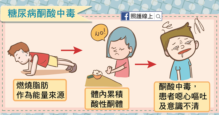 當糖尿病患者身體難以利用糖做為能量來源時,會因此燃燒脂肪。當身體分解脂肪作為能量來源後會產生酸性的酮體,累積過多之後會造成酸血症,我們稱為「糖尿病酮酸中毒」,這種意識不清的狀況通常比較常發生於第一型糖尿病患者身上,但第二型糖尿病或妊娠糖尿病患者身上仍有機會遇上這種狀況。(更詳細的酮體代謝解釋,請參考「靠生酮飲食減重會導致酮酸中毒嗎?」這篇文章)
