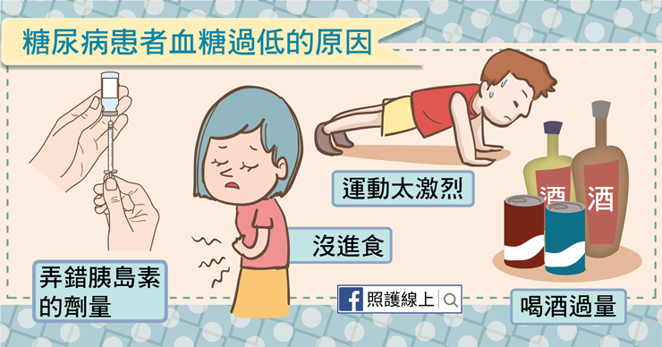 無論是打了太多胰島素,缺乏正常進食、運動太激烈、或喝酒過多都可能讓腦部血糖過低而無法正常作用,患者因而昏倒。