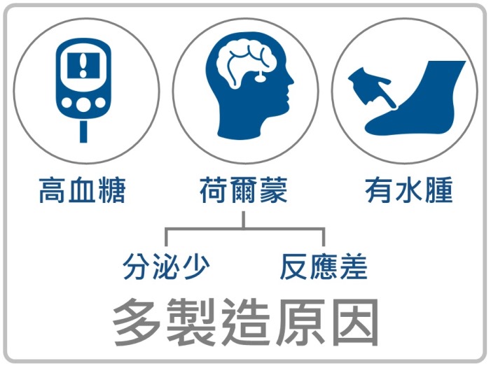 而常見的原因包括糖尿病控制不良的高血糖、荷爾蒙(抗利尿激素)分泌過少或反應不佳、身體有水腫多餘水份的狀況。