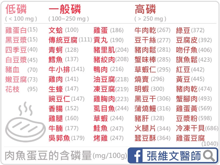 從上面的表格可以發現,蛋魚肉豆這些富含蛋白質的營養食物,磷的含量通常都很高。