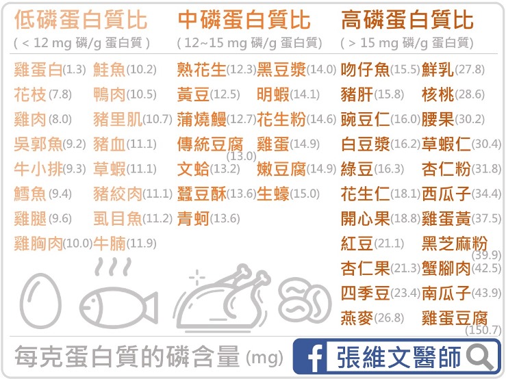 在此介紹給大家一個方法,可藉由計算出食物的「磷/ 蛋白質比」,比值愈低者(至少小於 15,若能低於 12更好),表示每克蛋白質的磷含量愈低,代表是適合透析病人多多攝取的優質飲食來源。