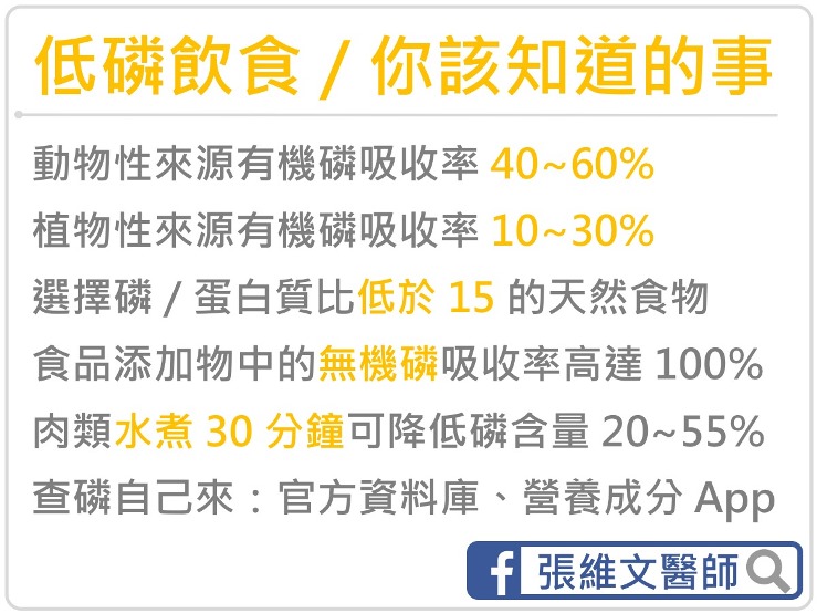 在慢性腎臟病但尚未進入透析階段時,我們會要求病人採取低蛋白飲食,以減少腎臟的負擔;減低蛋白質攝取量的同時,也減低磷攝取量,是一舉兩得的飲食策略。