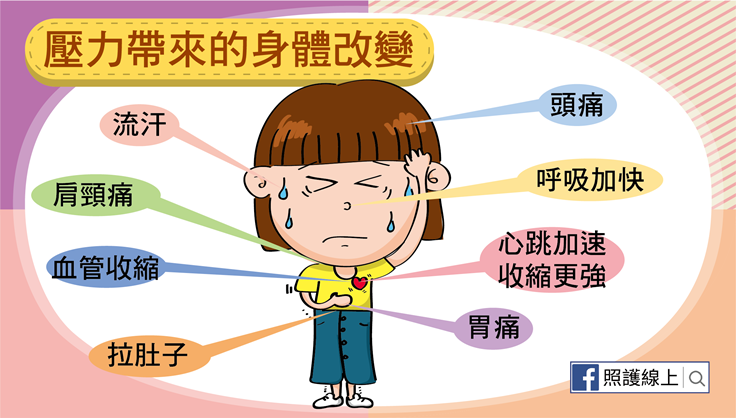 長期壓力就像你打了拖延三十年的戰爭般,從頭到腳改變一個人,你可能會常常頭痛、肩頸堅硬、心跳加速、呼吸加速、胃痛、拉肚子、與背痛。