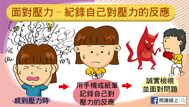 首先,你得找出讓自己感到壓力的來源,並分辨自己對壓力的反應。如果你覺得有壓力,你是拳頭變硬了?牙關緊閉?還是心跳加速?或無法思考,僅能反覆記掛著同一件事情呢?每個人對壓力的反應可能不同,現在手機很方便,可以快速錄音或錄影,讓自己講述面對壓力時當場的感受,當然傳統紙筆也是好方法,讓自己有停下來思考的空間。當你試著記錄下來自己在壓力下發生了哪些變化,做了哪些事情,不是要拿去po在網路上宣洩情緒,而是要讓自己誠實面對問題並好好檢視的。