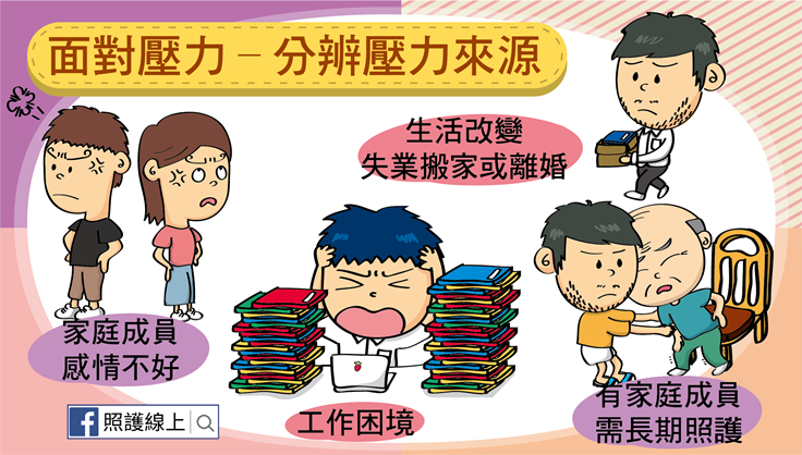 多數人的壓力來自於工作、經濟問題、或婚姻(伴侶)等。有人是因為家庭成員感情不和睦、或是工作讓人太疲憊或無趣。一些生活改變,不論是好是壞,像是失業、搬家、離婚、家中有新成員誕生,也都可能是讓我們生氣、緊張、害怕、坐立難安的原因。現在,隨著平均壽命的拉長與醫學的進步,「有家庭成員需要長期照護」這項目也變成了常見壓力來源。