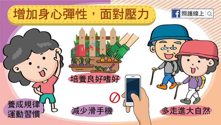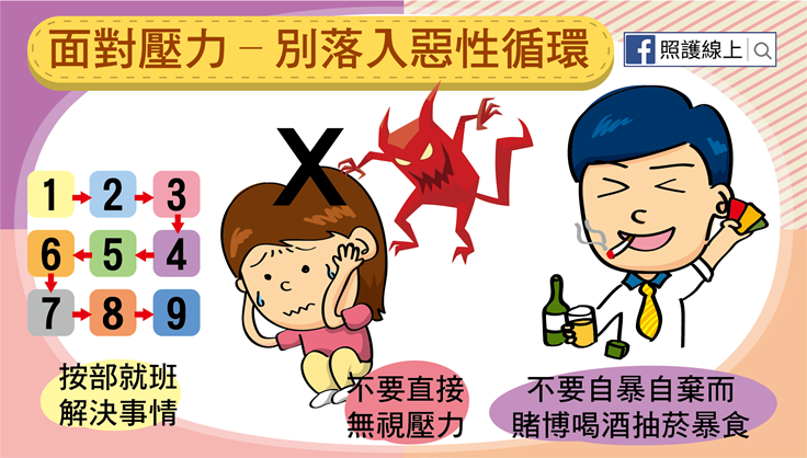 面對壓力,養成規律運動、不要暴飲暴食、睡眠充足、不抽菸、不過量喝酒的習慣很重要。擁有健康的身體,面臨壓力時你才會更有勁,才有打贏的機會!當你覺得壓力太大時,可以先減少看手機、電視、平板螢幕的時間,走到戶外接觸大自然,觀察細微的環境變化,一草一木的生長,進而對自己的生活狀況有更多覺察,才不會愈陷愈深,適時尋求幫助,適時做出選擇,別讓自己總困在局裡。