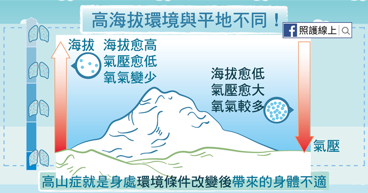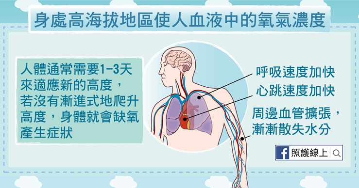 因此位在高海拔地區會容易讓血液中的氧氣不足,身體因而促使我們心臟及肺臟更努力工作,心跳及呼吸速度都會加快,希望能帶上足量的氧氣至其餘器官。爬山時若海拔爬升太快的話,身體獲取不到足夠的氧氣,就會引發症狀。另外,在高海拔地區也會造成水分容易從微血管散失,蓄積於肺臟和腦部。