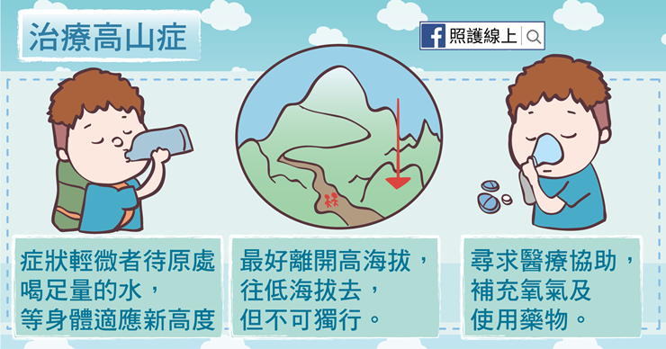 若症狀嚴重,務必及早下降至少六百公尺的高度,若症狀還沒有改善,就要更往下並尋求醫療協助。